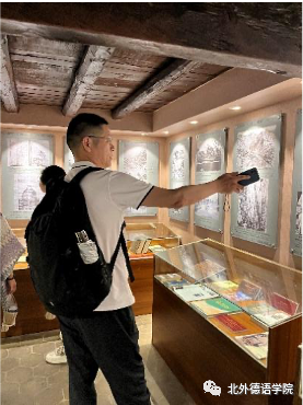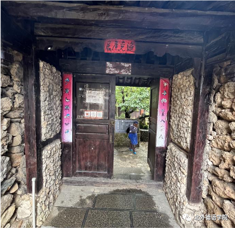 洛克故居门前用东巴文书写的对联“新年新月新气象  千花万花已出来(根据纳西族阿妈介绍音译)”让党员教师感受到了象形文字的魅力。