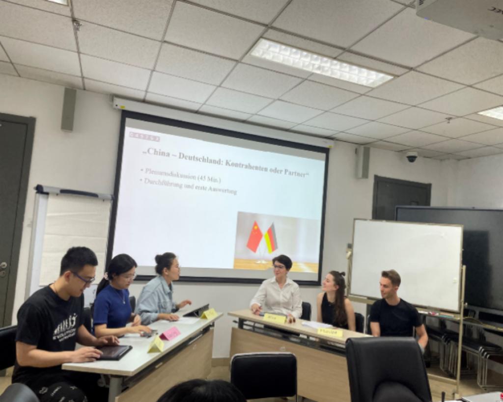 工作坊首日,中德两国同学通过破冰式的自我介绍迅速建立了友好关系,拉近了彼此的距离在首轮的讨论环节中,双方学子坦诚交流了对彼此团队的期待以及预期中的对方对自身团队的期待,为后续的深入交流奠定了坚实的基础当天下午,一场主题为“中国与德国:对手还是伙伴?”的热烈讨论,学生们对两个国家在国际舞台上的角色与互动有了更深刻的理解。次日,学生们聚焦于生活与工作中的中德价值观,通过团队合作,共同展示了精彩的观点碰撞与深入交流最后一天,工作坊迎来了高潮——模拟创建中德合资企业的实战演练:中德两国同学分组投入模拟的中德商务环境中,亲身体验跨文化合作的挑战与魅力在展示环节,学生们展现了丰富的合作成果,充分体现出跨文化语境的协同作用和中德文化间的精彩交融。