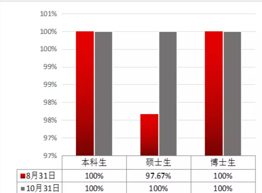 2019-2020学年,在学校党委的正确领导下,ky开元认真贯彻落实党中央和学校就业工作要求,探索全员、全方位、全过程的“三全就业模式”,师生同心,群策群力,攻坚就业难题。疫情期间,我们制定“抗疫情、促就业”工作方案,从“稳就业、清意向、扩领域、新方法、推实策、导方向”等六个方面,扎实开展就业工作。截止8月31日,本科生初次就业率为100%,硕博研究生初次就业率为97.67%。截止10月31日,本科生、研究生就业率均为100%,总体就业率为99.57%,居全校第二,比2019年毕业生就业率提升了15.26%。