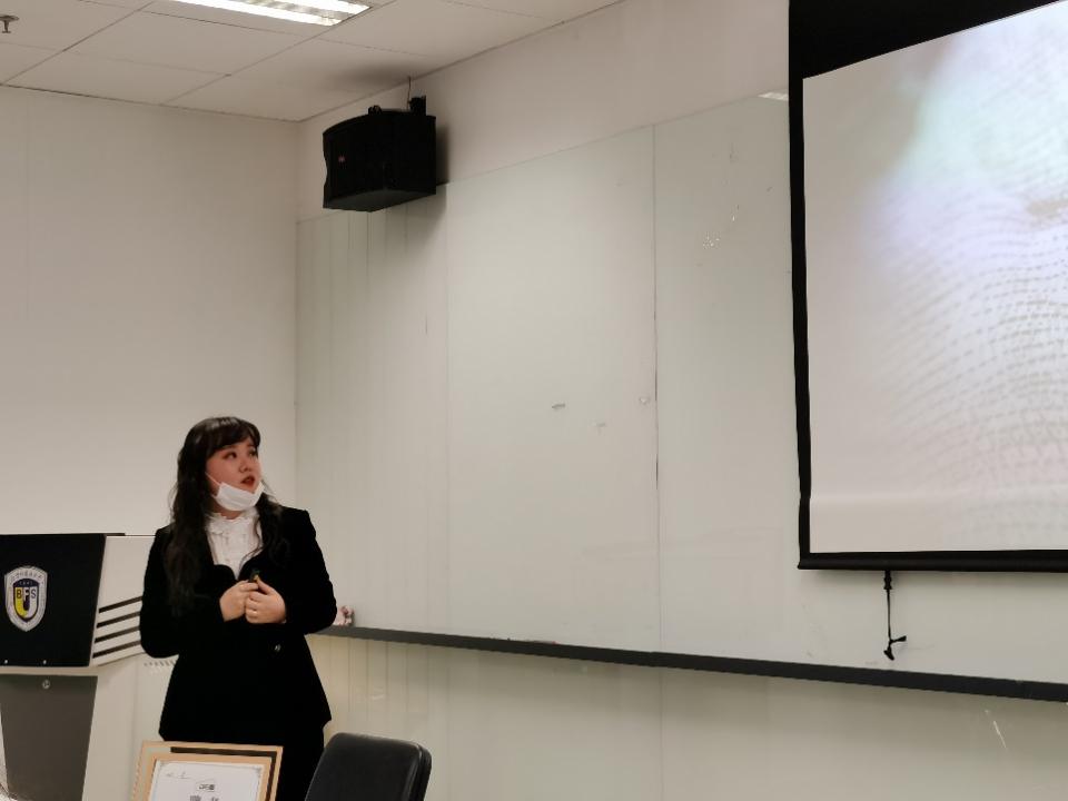 聘任仪式结束后,分享会正式开始。第一位分享的是从事策划编辑工作已13年的田恬校友。她主要从行业优势、选择这个行业的原因以及出版社工作日常三个角度为到场的师生们做了分享。首先,她谈到小语种学习者在图书编辑、策划领域所具备的独特优势,“使用外语,又不限于外语”是这个行业对外语工作者的期盼。随后,她详细介绍了出版社编辑的发展路径,特别提到出版社作为以内容甄选及生产为核心的文化产业,具有较高的整体素质和友好的沟通氛围。最后,田恬校友特别介绍了她所在的北京科学技术出版社,对当下的工作范围、合作伙伴和工作环境等进行了详细分享。