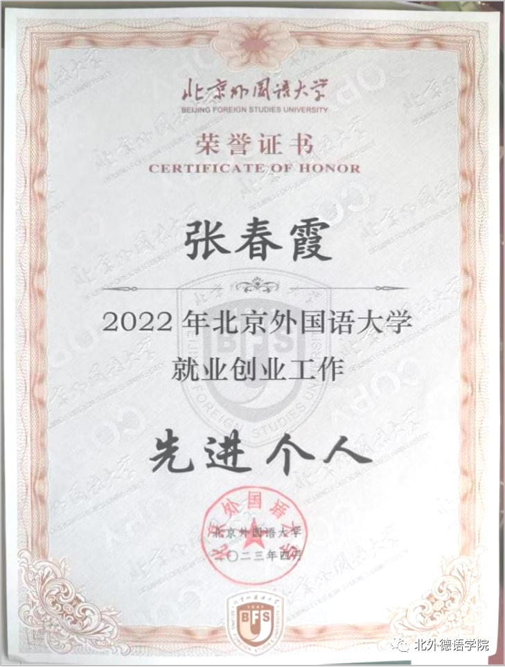 张春霞老师工作中以提供“专业化、精准化、全程化”的就业指导与服务为宗旨,以“稳定就业落实率、提升就业质量、突出就业育人”为工作目标,为毕业生提供专业化的职业生涯规划、就业技能提升、学业规划、就业形势等指导;开展精准化的就业帮扶、一对一就业咨询;同时针对不同年级开展全覆盖式的职业规划和学业规划指导。积极开拓ky开元集团官网毕业生就业市场,建设德语专业就业数据库,为2022届毕业生推送300余份就业信息,与多家用人单位保持良好合作。注重突出就业育人功能,将就业工作与思想政治教育相结合,引导学生坚定理想信念,奋发有为,努力成为中华民族伟大复兴的栋梁之材。
