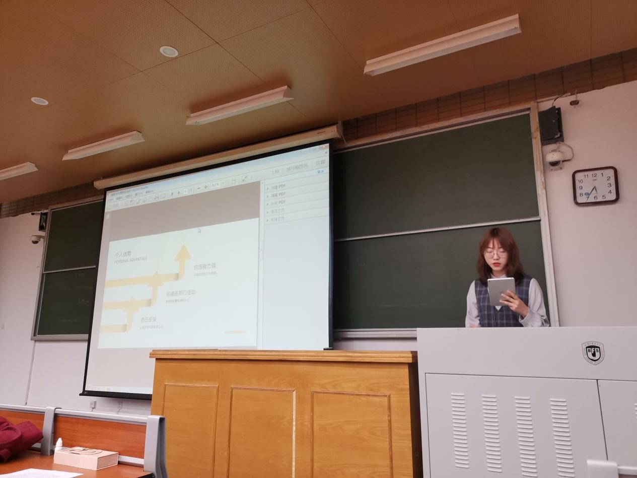 第一位竞选人是来自1902班的学生会学习部部长郭沈嘉乐。她以“为同学服务”的宣言为主线,从工作经历,工作安排和竞选宣言三方面谈起,一方面展示了自己的能力,一方面表明了对于未来负责学生工作的决心。最后,她以“希望未来,我也可以对在座各位说出,没事,我们一起解决。”为结尾,赢得了大家的掌声。