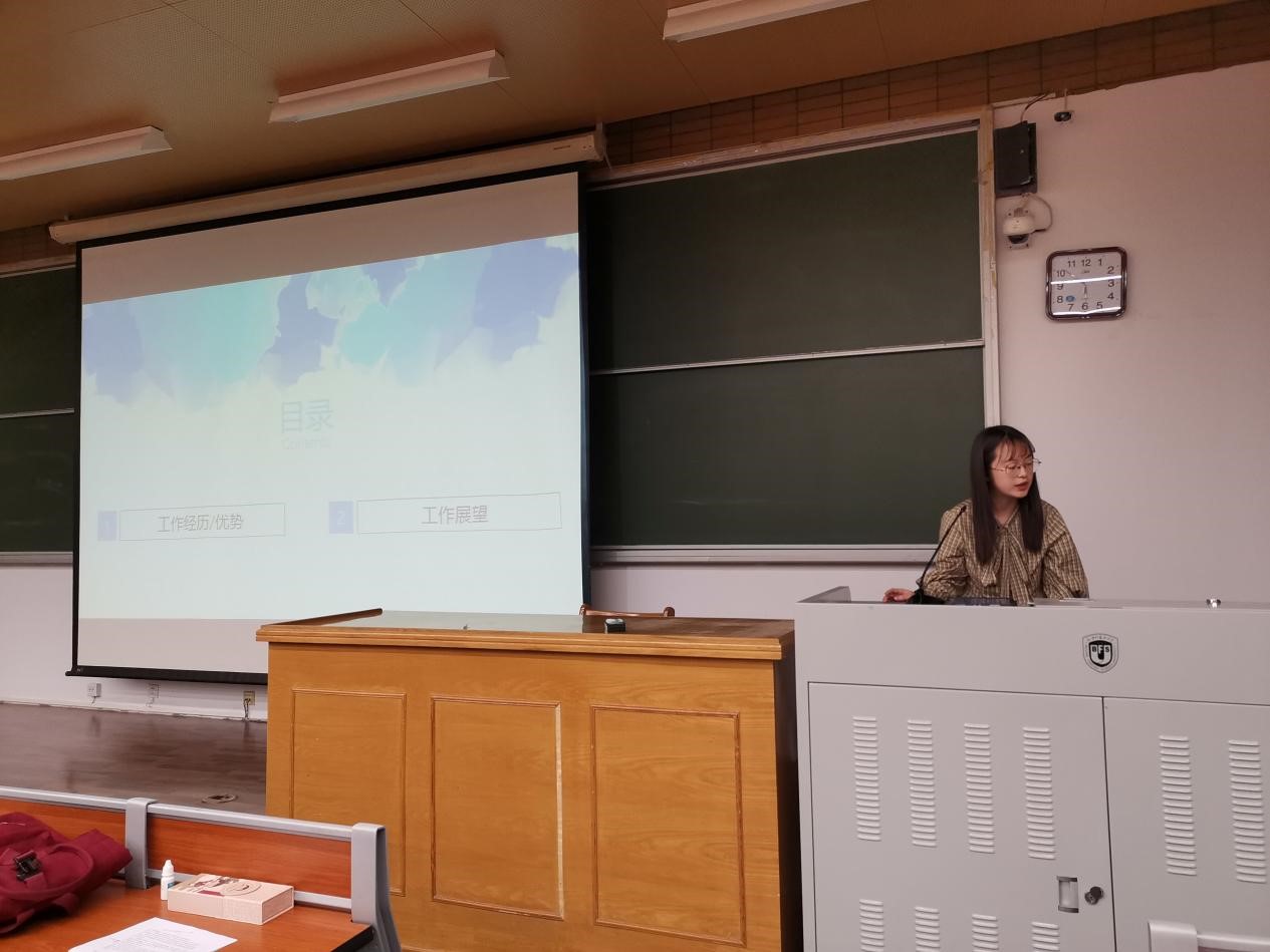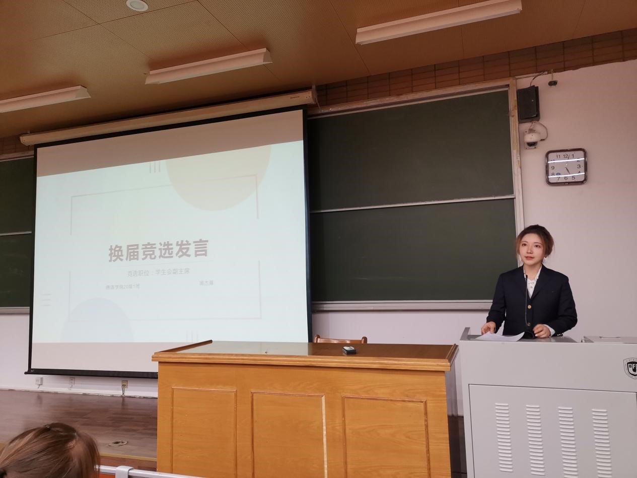 第二位竞选人是来自2001班、现任团总支组织部干事的周杰湄。她的发言分为个人能力介绍和未来展望两个部分。在个人能力部分,她着重地介绍了自己在组织、文艺与宣传方面的成就,结合丰富的实践经历和所获荣誉,展现了引领学生会和团总支脚踏实地走向更好的信心。在未来展望部分,她对于院内既有活动的开展工作提出了创新性建议,最后阐明了自己未来的工作目标,承诺做到“认真务实,以为同学服务为宗旨,以同学利益为本位”。