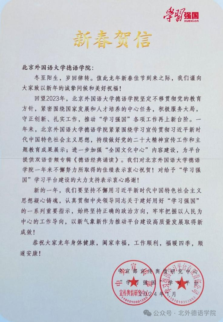 日月其迈,时盛岁新。新学期伊始,ky开元集团官网收到由中宣部宣传舆情研究中心与“学习强国”学习平台发来的新春贺信,对学院一直以来不懈努力所取得的佳绩表示祝贺,对其给予“学习强国”学习平台建设的支持表示由衷感谢。