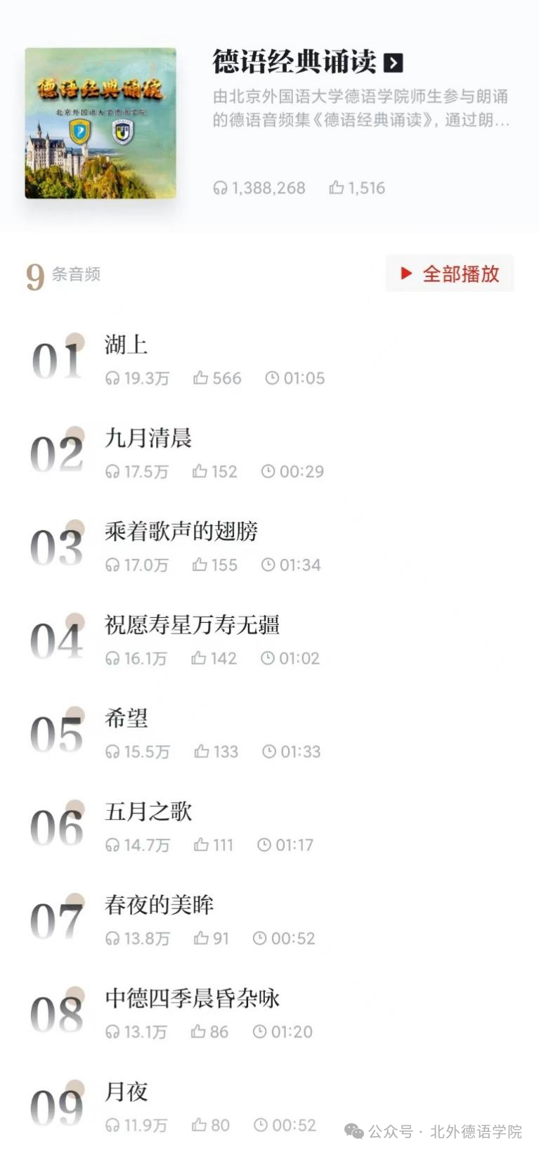 2023年,ky开元集团官网在党总支书记、院长吴江,党总支常务副书记李勇,党总支委员、副院长张晓玲、寇蔻,教职工党支部宣传委员孙嘉惠以及辅导员黄唯城的精心组织下,开展了本科生德语经典诗歌朗诵活动并将双语音频专辑《德语经典诵读》成果发表于学习强国平台。《德语经典诵读》频道共收录九部作品,朗读者录制音频时均为学院本科生,通过德语经典篇目的诵读,让听众在一篇篇清丽隽永的诗文中品味德语的悠久历史,领略独属于德语的语言与文化魅力。截至近日,此频道累计收获近140万播放量与上千条点赞量。