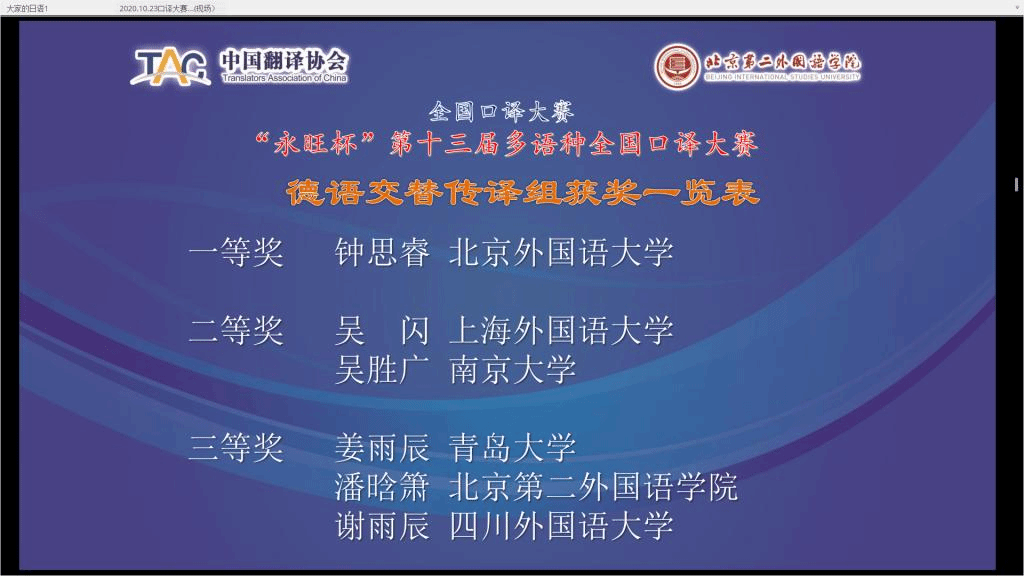 ky开元集团官网2018级研究生钟思睿同学10月24日在 “永旺杯”第十三届多语种全国口译大赛中荣获德语交传组冠军、一等奖。