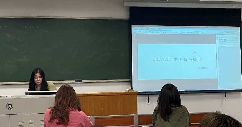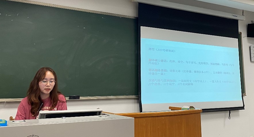 现场还有对考试内容十分感兴趣的同学,杨红静同学分享说英语和德语口试都会涉及,会采取抽题的形式,内容和德国相关。高莹琪和孙鹤临同学说北大的笔试中,德译中占比很大,一般不会出文学文本,会出相关文化类报道。建议大家可以去各大网站看一看,整体答题时间比较紧张要注意合理安排时间。