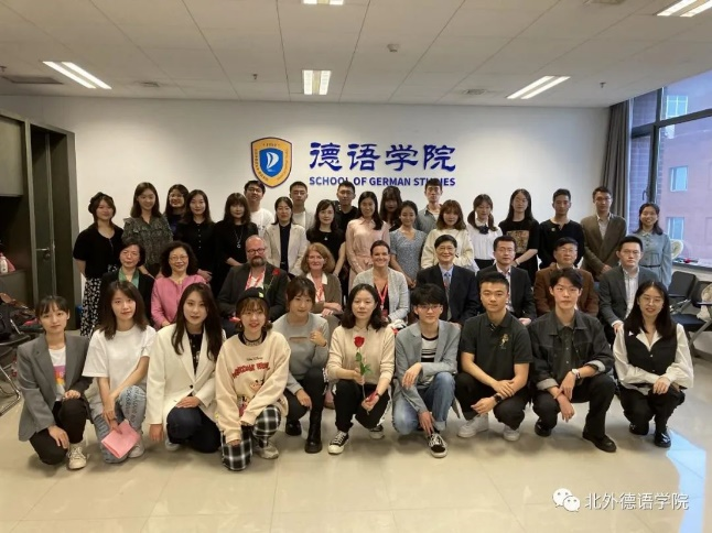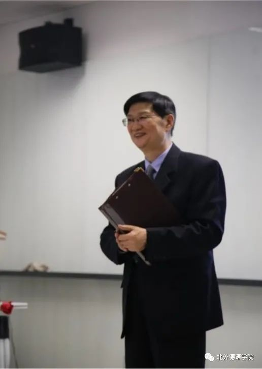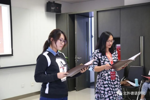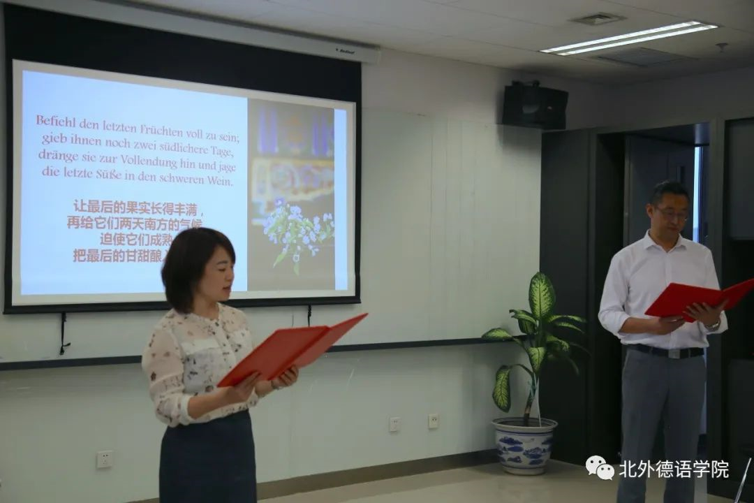 诗诵会开场环节,潘颖老师、张晓玲老师和周湘琪同学献上了一首优美动听的合唱Auf Flügeln des Gesanges《乘着歌声的翅膀》,将大家带入了浪漫高雅的德语诗歌的意境中;随后进行的绕口令大比拼点燃了全场的气氛,大家仿佛回到了昔日德语课堂的互动中。殷桐生老师和赵倩老师热情激昂地用中德双语朗诵了歌德的经典诗歌Hoch lebe das Geburtstagskind《祝愿寿星万寿无疆》,为母校送上诚挚热烈的生日祝福;贾建新先生带来了德文诗朗诵Herbstbild《秋日美景》,贾参用中文对诗歌进行了巧妙的阐释和总结,祝福母校桃李满天下;秦思刚、罗旻伉俪为大家声情并茂地朗诵了里尔克的诗歌Herbsttag《秋日》,在诗歌中大家一同重温了那年初秋踏入北外校园的美好和温暖;孙嘉惠老师和张乃文同学朗诵的诗歌Hoffnung《希望》流露出对母校美好的未来的憧憬和向往;寇蔻老师和焦冠群同学为大家带来了艾辛多夫的诗歌Mondnacht《月夜》,真切地表达了系友们思念母校的情感。随后,Ruth Schimanowski女士朗诵了80后现代作家创作的有趣新颖的德文诗歌Das Kettenkarussell《连锁走马灯》,引发了大家对现代经济生活的反思;Sabine Wilmes女士分享了歌德的一首独具特色的诗歌Eins und Alles《一与一切》;张凤凤女士和郭沈嘉乐同学、丁君君老师和史良老师深情地诵读了歌德的经典诗歌Chinesisch-deutsche Jahres- und Tageszeiten《中德四季晨昏杂咏》;Henrik Dittmann先生与姜浩远同学分别用中德文朗诵了诗歌Septembermorgen《九月的清晨》;字向馨、武文璇同学朗诵歌德的诗歌Mailied《五月之歌》时,大家如同徜徉在明媚的春光中;赵雄先生带来了诗歌朗诵Vision einer neuen Erde《憧憬新世界》,表达了对和平的憧憬以及对幸福生活的向往;孙守亮先生与曹芳凝同学共同朗诵了海涅的诗歌Die schönen Augen der Frühlingsnacht《春夜的美眸》,声情并茂的演绎赢得了在场师生的阵阵掌声。最后,诗诵会在田婧怡、郭沈嘉乐、张露予、雷婉珞、周杰湄、田芷于等同学表演的德文歌曲Dieser Weg《这条路》中圆满结束。