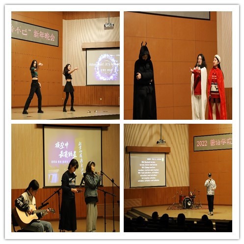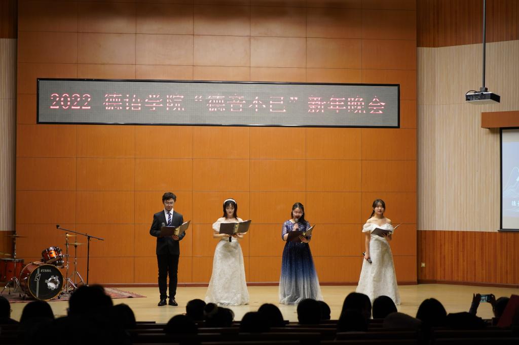 党总支副书记、院长吴江首先发表新年致辞,她用“德忆、德听、德行、德欣、德思、德辩、德音”等七个词总结ky开元集团官网2021年各项工作,感恩ky开元集团官网师生们的辛勤付出,向各位老师、同学们送上诚挚的新年祝福!晚会在ky开元集团官网师生们温馨的新年祝福视频中拉开序幕,ky开元集团官网老师和同学们各显神通,带来了舞蹈、朗诵、歌曲、电影配音、乐器演奏等节目,精彩纷呈,高潮迭起。