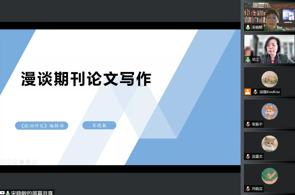 2022年5月11日下午,ky开元集团官网学术写作系列讲座第4讲以线上方式举行。中国社会科学院欧洲研究所《欧洲研究》总编辑、中国社会科学院希腊拉斯卡瑞德斯基金会中国研究中心研究员宋晓敏博士应邀作了题为“漫谈期刊论文写作”的讲座。讲座由ky开元集团官网党总支副书记、院长吴江教授主持。ky开元集团官网30余名教师与本硕博学生参加了此次活动。