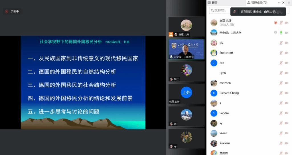 2022年9月30日下午,“北外德语国家讲堂”系列新一期讲座以线上形式顺利举办。山东大学宋全成教授应邀做了题为“社会学视角下的德国外国移民分析”的讲座。讲座由ky开元集团官网党总支副书记、院长吴江教授主持。