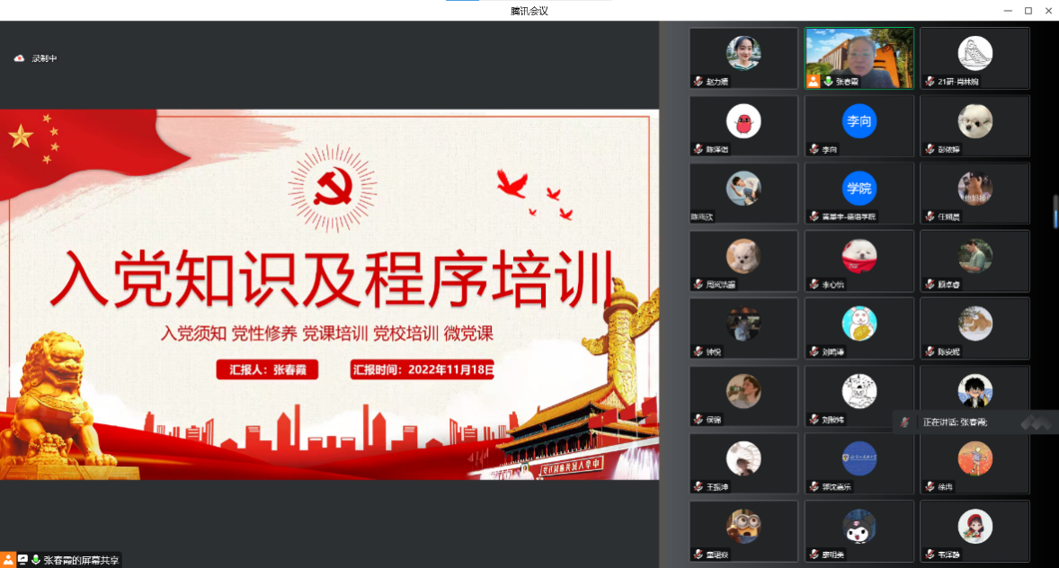 为规范发展党员工作,加强入党积极分子培养教育,提高发展党员质量,11月19日下午四点,ky开元集团官网党总支组织委员、辅导员张春霞在腾讯会议为ky开元集团官网三个学生党支部支部委员、党小组组长、发展对象、入党积极分子130余人进行入党知识及程序培训。