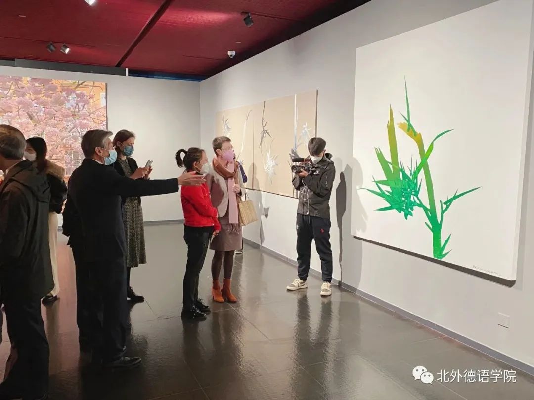又如展览中的许多抽象主义画风的作品,旅德中国艺术家或用线条,或用色彩斑块来表达抽象,但又极其富有强烈的感性特征。朱金石的大型作品“凋零的时代正在开放”、邓国源的系列作品“在花园”都是用大量色彩斑块形成抽象风格,傅融大使仔细观看作品展签,详细询问作品名称与材质。傅融大使对现代艺术作品的丰富材质表现了极强的兴趣,她对范院长说现在真是一个自由的时代,艺术风格多样,创作风格拥抱不同的可能性。在吕山川的作品“外滩”中,范院长说到虽然笔墨抽象,但也能从中窥探出是城市的外观。傅融大使对此很惊讶,并认真地说到:“哦,我觉得是骆驼群! ”。话音刚落,大家不由自主地都笑了。艺术欣赏就是这么的见仁见智。在看到杨恺亮的油画作品“樱花”时,傅融大使说到:“这个我熟悉,它表现的就是德国的街道与樱花”。同时,傅融大使又对单凡的系列作品“缓慢之作”表现了很大的好奇心,她觉得作品在表现中国的传统意象竹的同时,又融入了一些德国元素。在观看青年画家吴哲仁的艺术作品“8字下的扭曲”时,傅融大使饶有兴致地询问范院长,8在中国文化的意义。听完范院长的解释,她知道了8是中国的幸运数字。