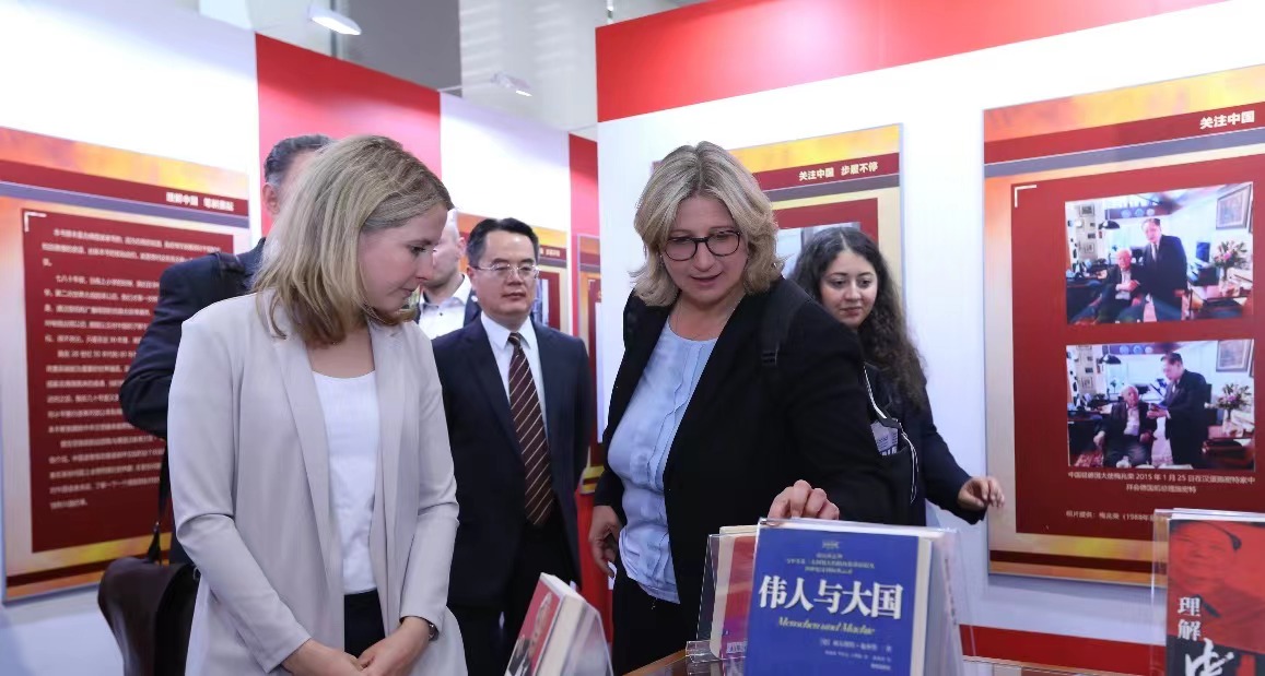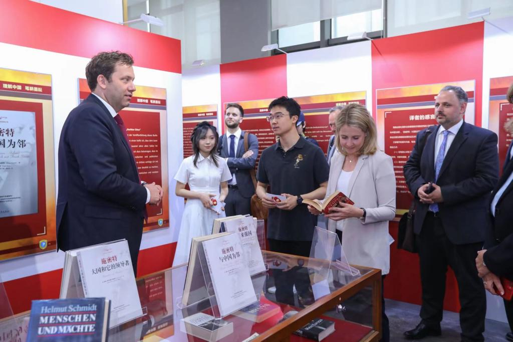 施密特一生撰写了多部以中国为主题或与中国相关的论著,许多著作的中译本都凝聚了北外校友的心血,例如中国前驻德国大使梅兆荣先生领衔翻译的《与中国为邻》(Nachbar China)、《伟人与大国》(Menschen und Mächte)以及已故北外ky开元集团官网教授刘芳本老师领衔翻译的《行动起来 为了德国》(Handeln für Deutschland)等。展板的第四板块“理解中国 笔耕墨耘”展出了施密特经典著作的德文版以及中译本。克林贝尔在得知ky开元集团官网图书馆藏有诸多施密特著作及中译本后表示非常感动。代表团全体成员在书籍前停下脚步,认真翻阅,并对北外德语学科点在人才培养领域做出的杰出贡献表示赞赏。