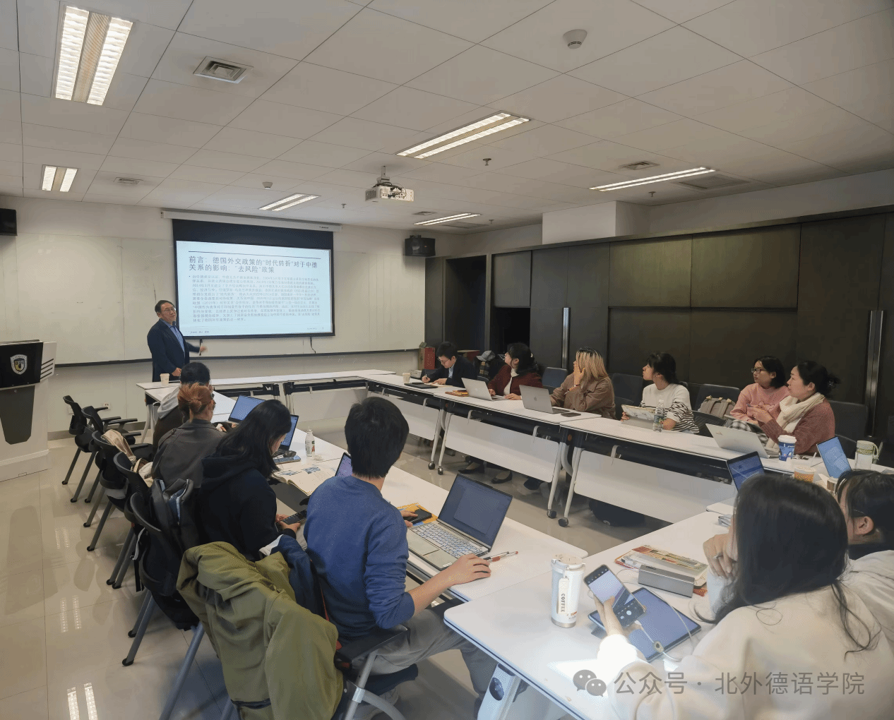 在问答环节,到场师生踊跃发言,就有关中德经贸新形势、德国“去风险”政策等话题与史世伟教授进行了互动和讨论。最后,寇蔻副院长对本次讲座进行总结,再次感谢史世伟教授带来的精彩报告。史教授的报告内容丰富,分析严谨,数据详实,有助于加强大家对于中德关系的理解,非常具有启发性和指导性。