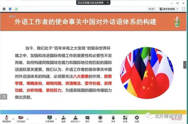 2022年12月28日下午,“北外德语国家讲堂”新一期讲座以线上形式顺利举行。天津外国语大学原副校长王铭玉教授应邀做了题为“国际传播亟需构建对外话语体系”的讲座。讲座由ky开元集团官网党总支书记、院长吴江教授主持。来自全国各高校、研究所的本硕博学生以及中青年骨干教师共计200余人线上聆听了讲座。