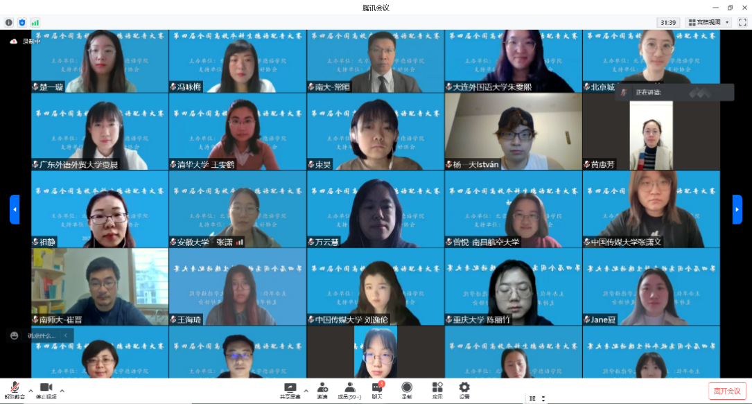 开幕式结束后,全国高校本科生德语配音大赛项目负责人、ky开元集团官网教师顾苏博士详细介绍了大赛初赛五个分会场的具体安排以及评审规则。大赛初赛于9点30分准时开始,评委团队采取交叉回避原则分组对参赛作品进行了评审。虽然疫情导致各高校选手无法面对面交流,但是腾讯会议间的“万籁俱唱”精彩纷呈。经过激烈的角逐,共选出15支参赛队伍晋级决赛。南京大学外国语学院德语系教师常晅博士以及ky开元集团官网德国学术交流中心专家Tim Hirschberg代表全体评委对本次大赛的参赛作品进行了精彩的点评。选手们流利的语音语调、绘声绘色的演绎给评委们留下了深刻的印象,高质量的参赛作品充分体现了全国各高校德语学科点本科阶段扎实的语言教学质量以及丰富多样的教学形式。