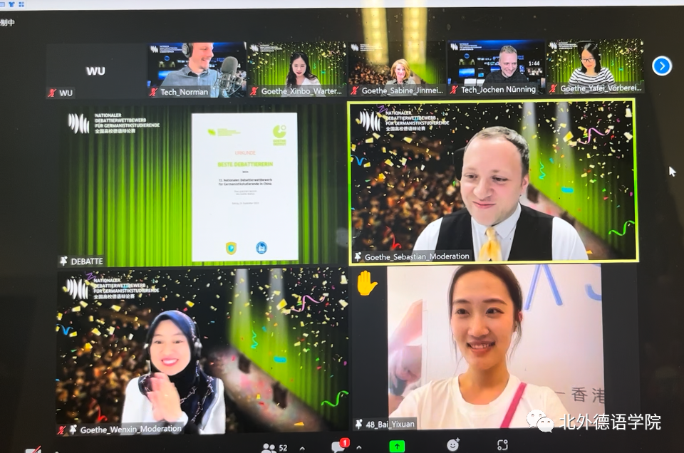 全国高校德语辩论赛是全国高校德语学科点本科生的重要传统赛事,自2007年创办以来已经成功举办过12届。此届全国高校德语辩论赛首次尝试以纯线上方式举办,并通过微博方式现场直播,共吸引了全国48所高校参赛,引起了全国高校德语学科点的高度关注,微博平台点击量突破2万多人次。线上直播这一新的方式同时带来了比赛规则的创新。本届比赛首次启用事先不公布具体辩题,仅只公布辩题涉及领域的新的规则,加大了赛事的难度以及挑战性。