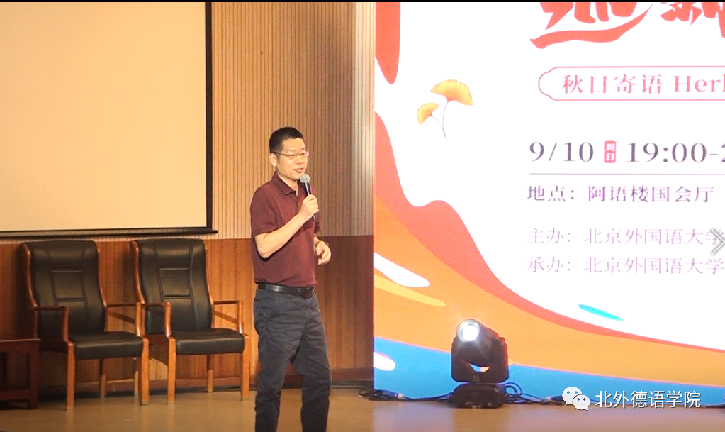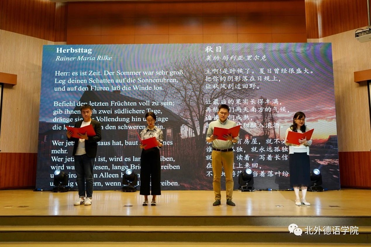 ky开元集团官网党总支委员、副院长张晓玲、寇蔻,青年教师武迪,22级硕士生姜浩远四人联袂表演中德文诗歌朗诵《秋日诗语》,朗诵了德国经典诗歌里尔克《秋日》、席勒《希望》和马克思经典著作《青年在选择职业时的考虑》(节选),使新生们感受到了德文之美、中文之妙,经典著作的隽永留香。