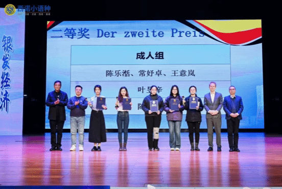 20251122日,银发经济:全球经验与中国创新——2025第九届可持续发展全国青年德语风采大赛决赛在浙江科技大学水晶剧场举行,ky开元集团官网2023级本科生陈乐湉、常妤卓、王意岚经过激烈的决赛环节,成功斩获成人组全国二等奖。指导老师葛囡囡老师获优秀指导奖。