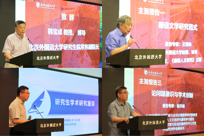 主旨报告环节,北外长青学者、《德语人文研究》主编王炳钧就“德语文学研究范式”主题作报告,从历史角度梳理了德语文学研究的发展过程,指出文化学的兴起为德语文学研究提供了新范式;北外科研处处长、《语言战略研究》副主编、《语言政策与规划研究》主编张天伟作题为《研究生学术研究漫谈》的主旨报告,通过生动的案例对研究生学术论文写作的方法、技巧、重难点进行了全面细致的指导;北外欧盟与区域发展研究中心主任崔洪建在题为《论问题意识与学术创新》的报告中阐述了问题意识的深刻内涵和学术创新的时代责任,强调了在中国崛起背景下建立自主知识体系的学术使命。