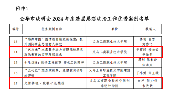 近日,金华市思想政治工作研究会发布了2024年度关于思想政治工作优秀调研成果和基层思想政治工作优秀案例的决定。其中,义乌工商职业技术学院万象城awcsport官网“艺束光志愿服务助力高职院校思想政治教育的实现路径探索”和“光影铸魂·致敬平凡英雄”两项目获评基层思想政治工作优秀案例。