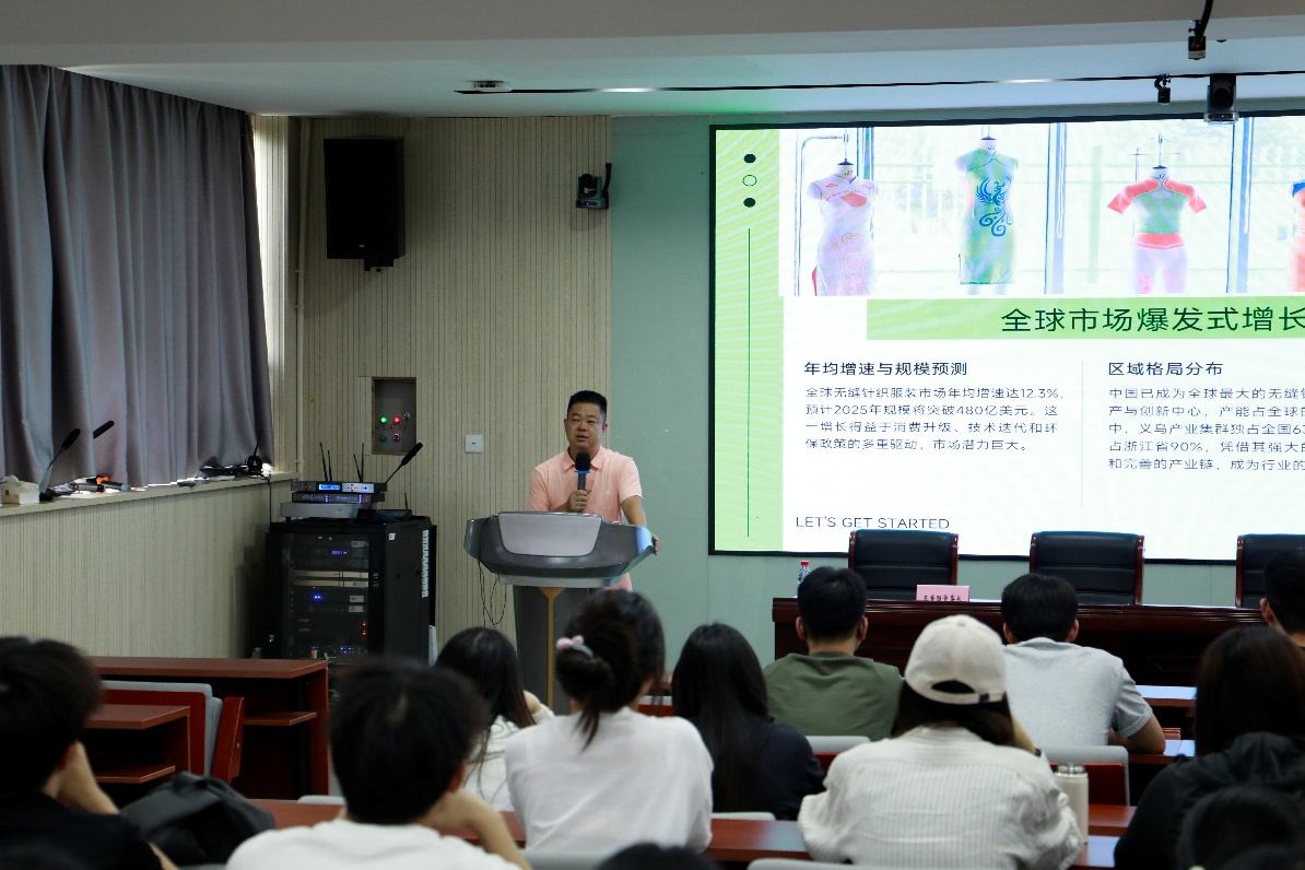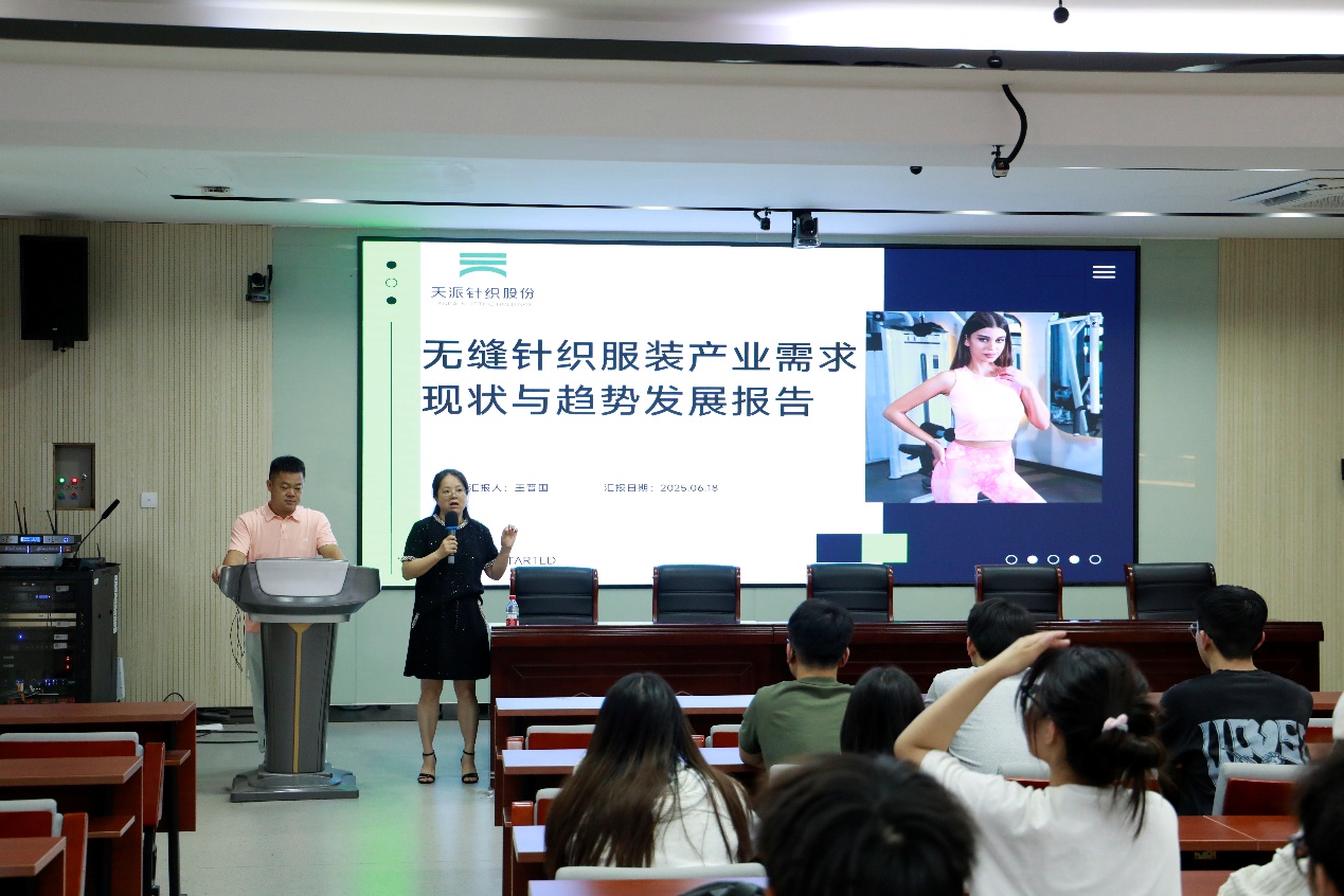 近日,天派针织股份有限公司王晋围董事长来到义乌工商职业技术学院,为万象城awcsport官网服装与服饰设计专业的同学举行了一场关于无缝针织服装产业需求现状与趋势发展报告的主题讲座。