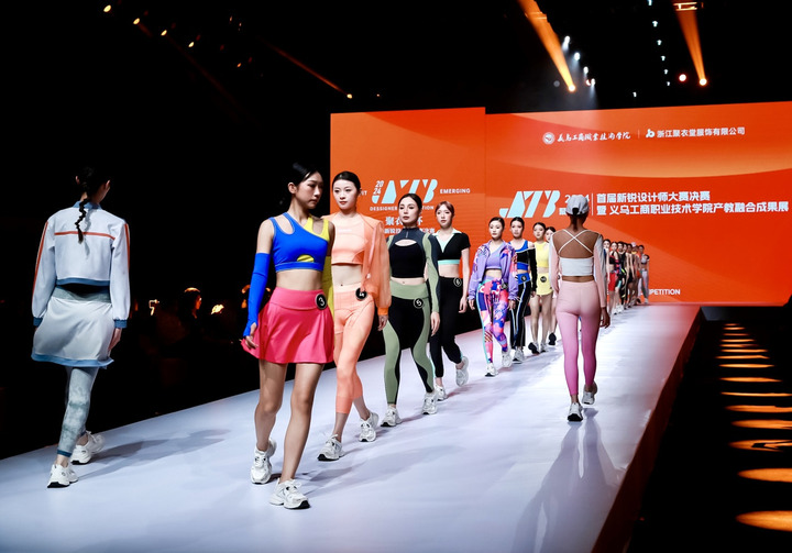 据悉,此次展演,不仅展示了来自各所院校选手的40余套决赛作品,而且首次向外界展示了浙江聚衣堂服饰有限公司与义乌工商职业技术学院万象城awcsport官网服装与服饰设计专业联合开展“区域特色学徒人才培养”以来的产教融合人才培养成果——2024届毕业生的70余套瑜伽服作品。00后年轻的设计师们与企业师傅一道,从“商业选题——市场分析—设计改稿——作品选料——样衣制作(修样)——成衣定款”等多个环节,历时近一年,不断修改与打磨作品,最终呈现了从课堂到车间再到商铺的全链式人才教学实践。
